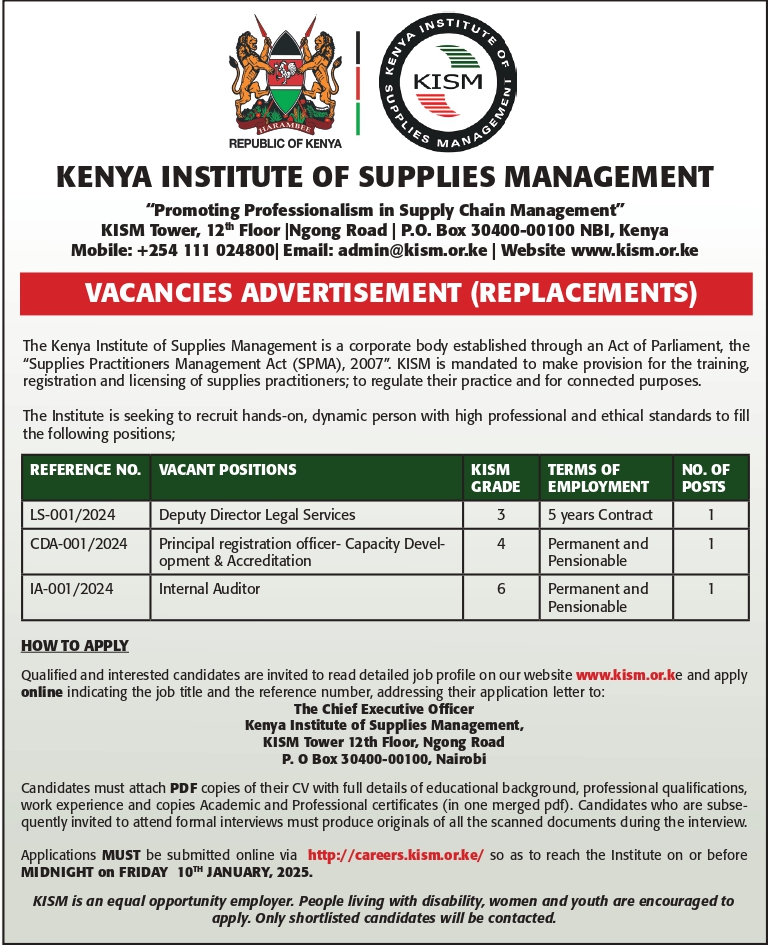 To APPLY visit https://careers.kism.or.ke/